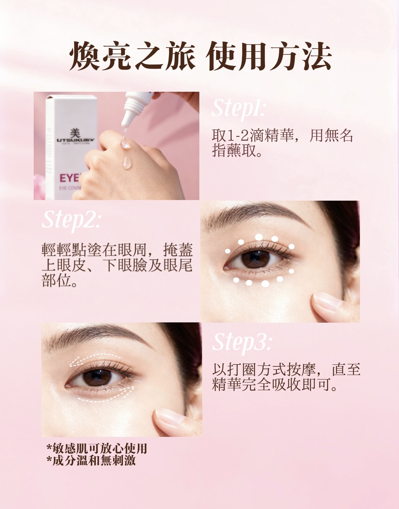 眼部精華,淡化黑眼圈、撫平細紋、消除浮腫。效果立竿見影,持久耐用。